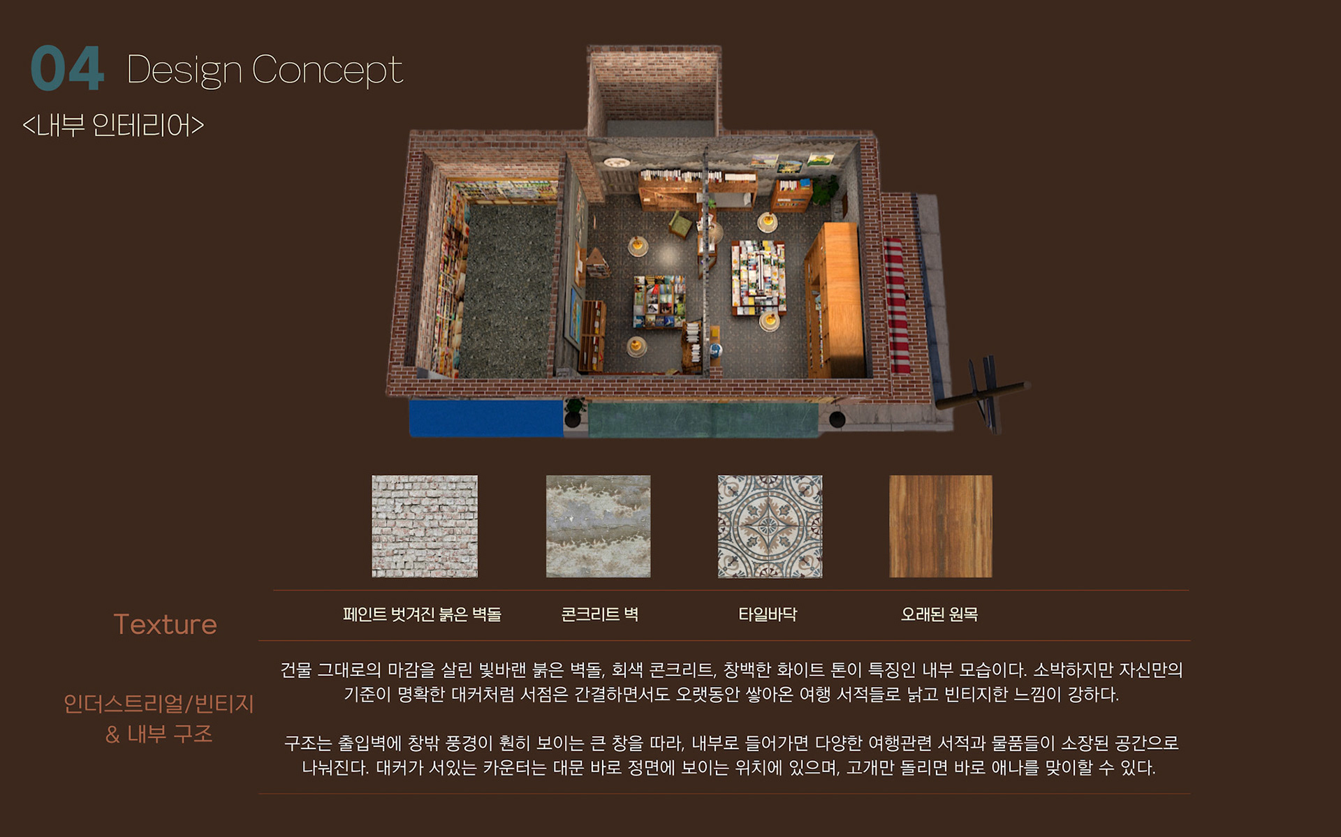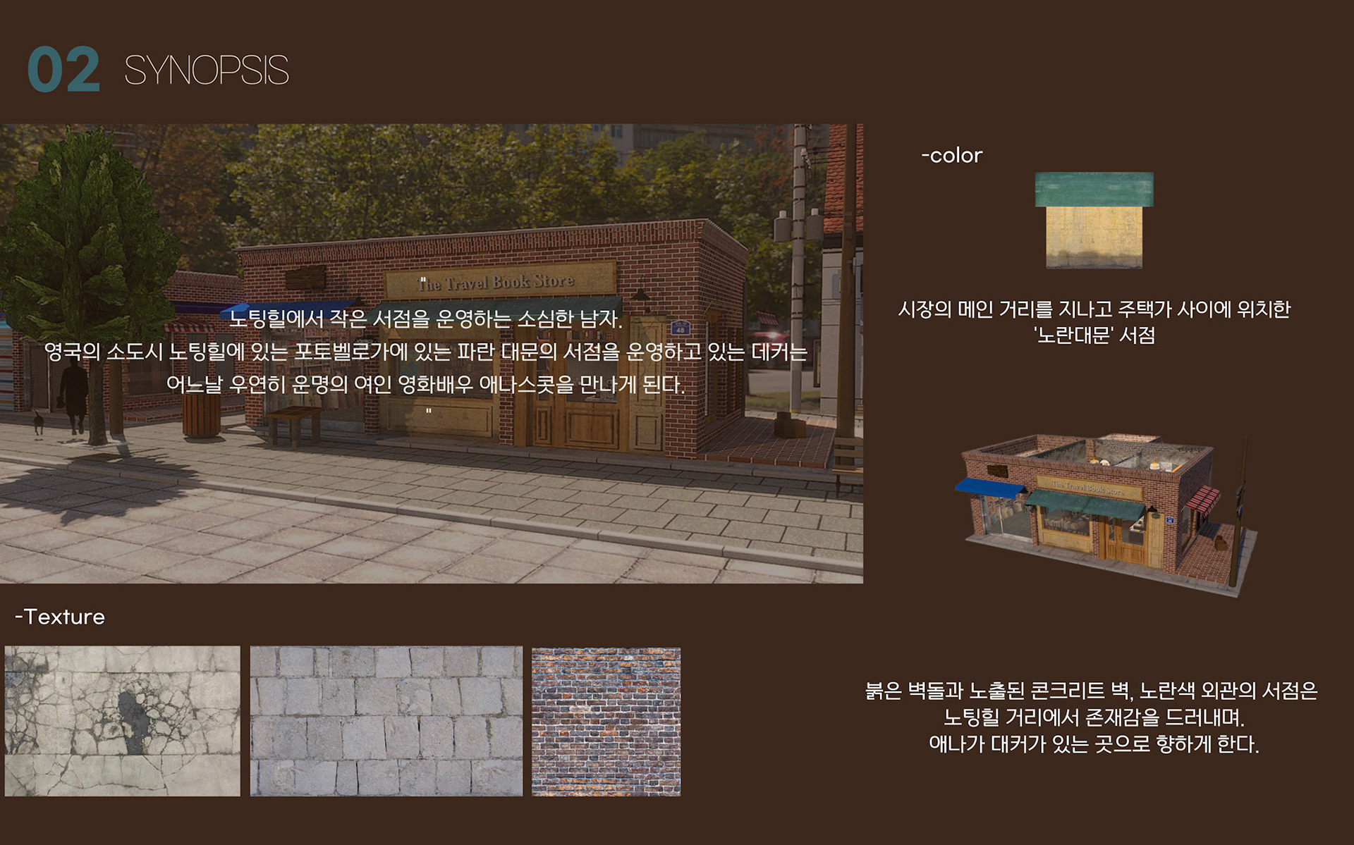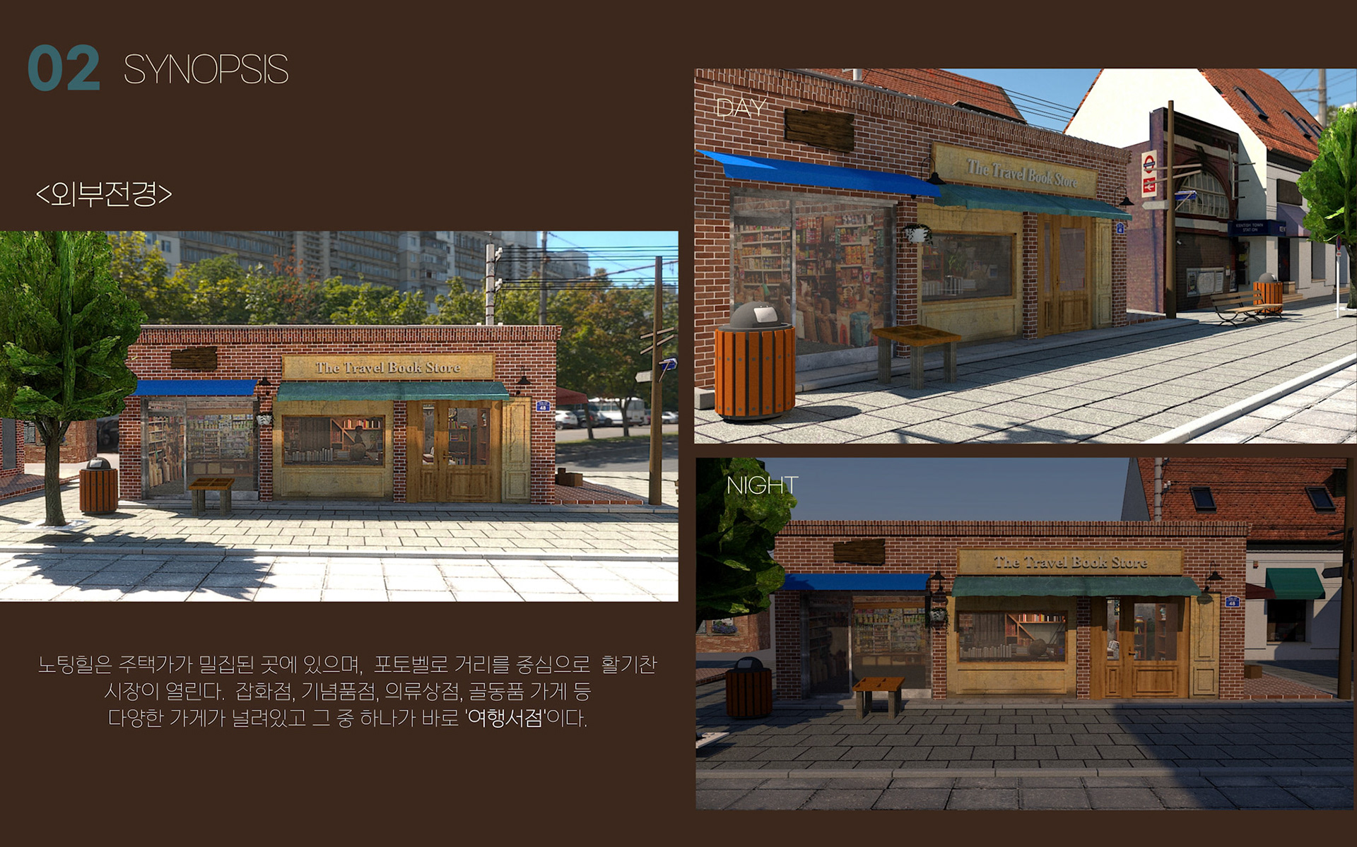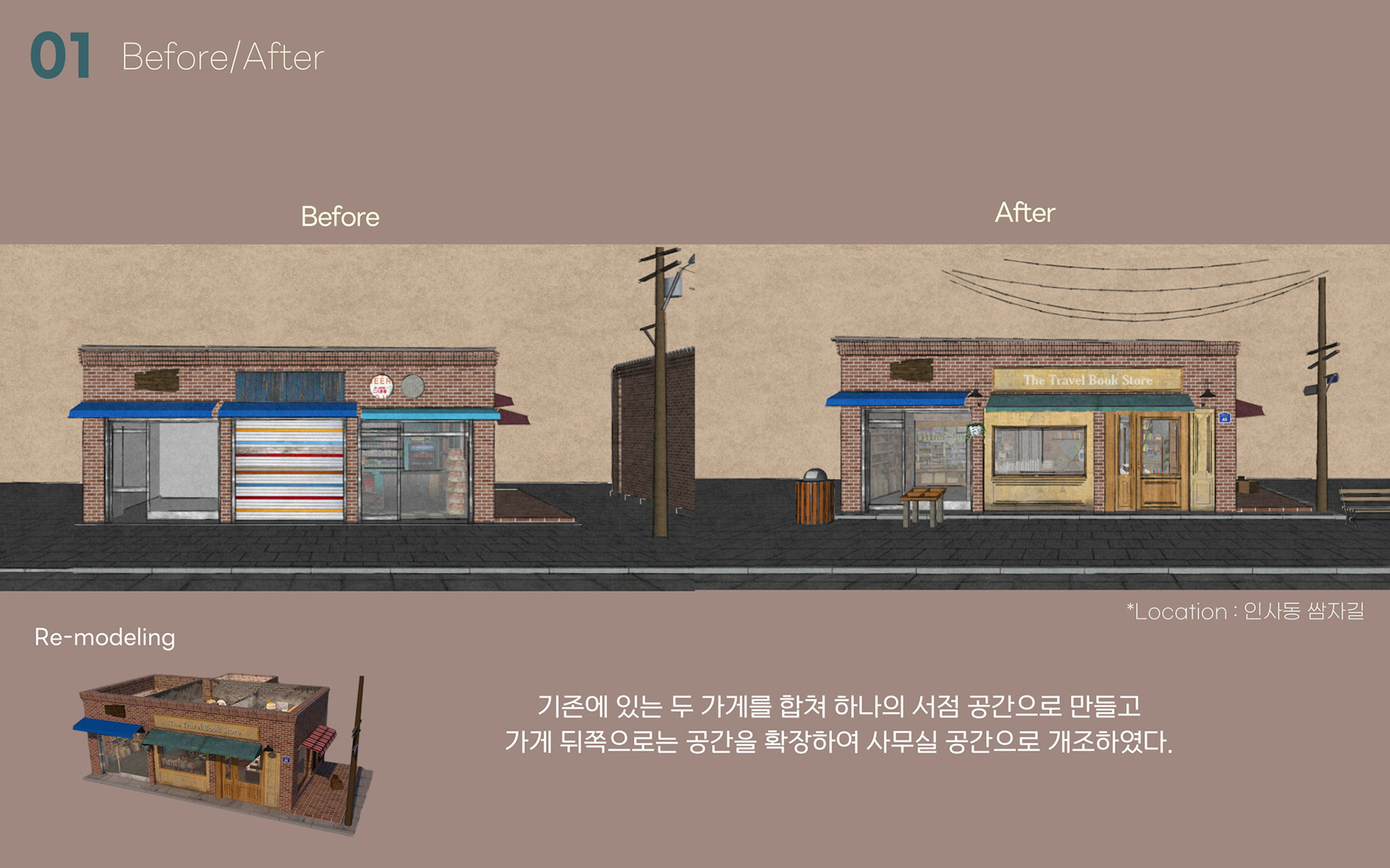 영화 노팅힐의 서점 공간을 모티프로 삼아, 인사동의 버려진 장소를 여행서점으로 재구성한 프로젝트이다. 낡지만 친숙한 분위기를 통해 방문객들의 추억을 상징하며, 영화가 지닌 서정적 흐름을 공간 속에 담아냈다.